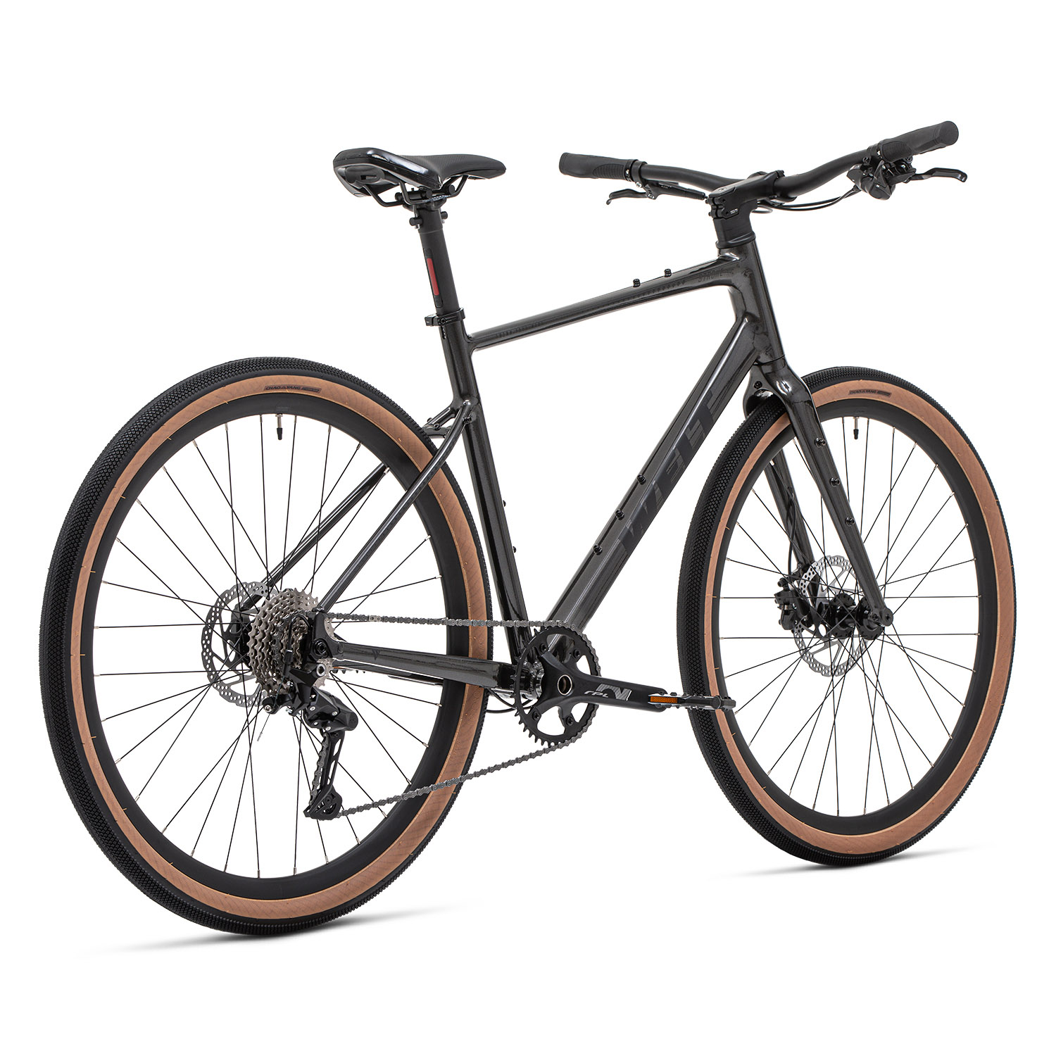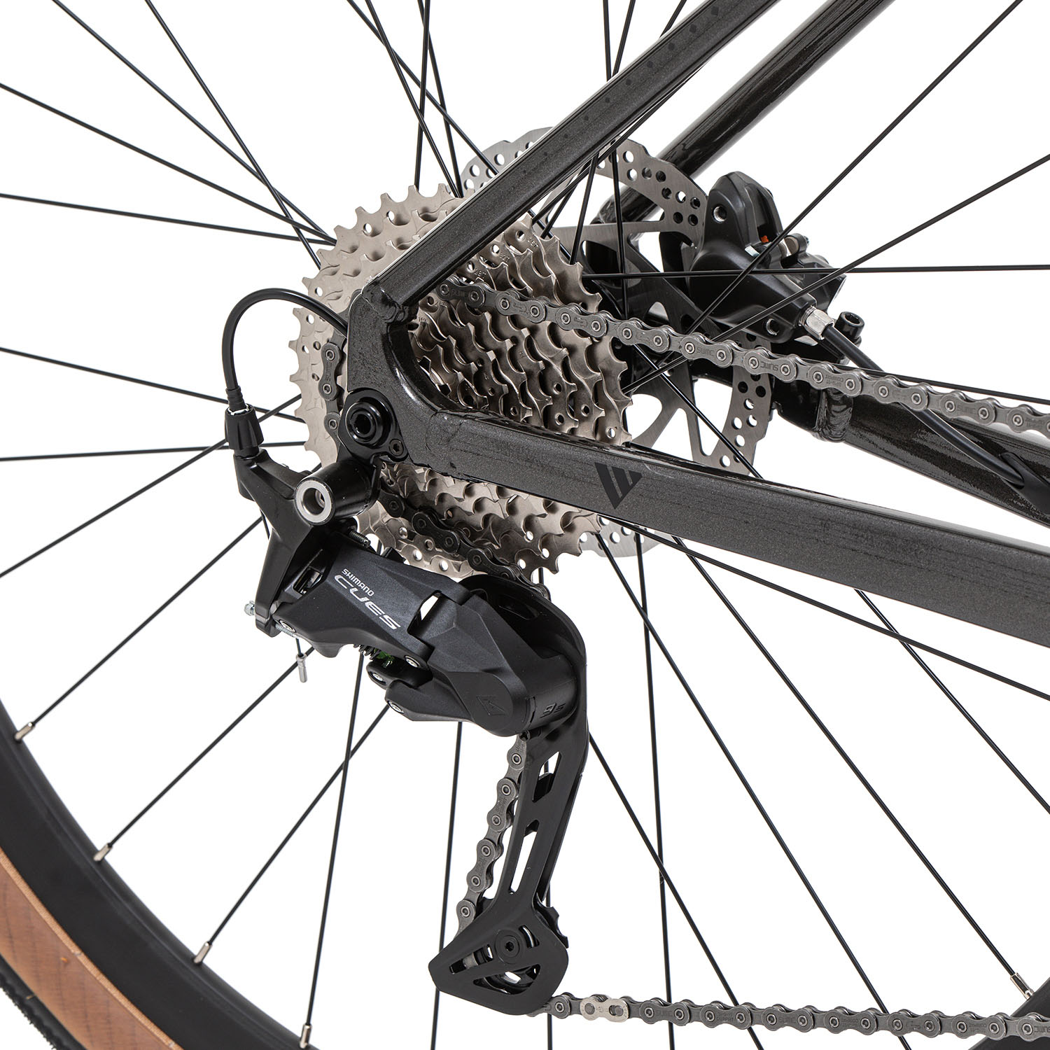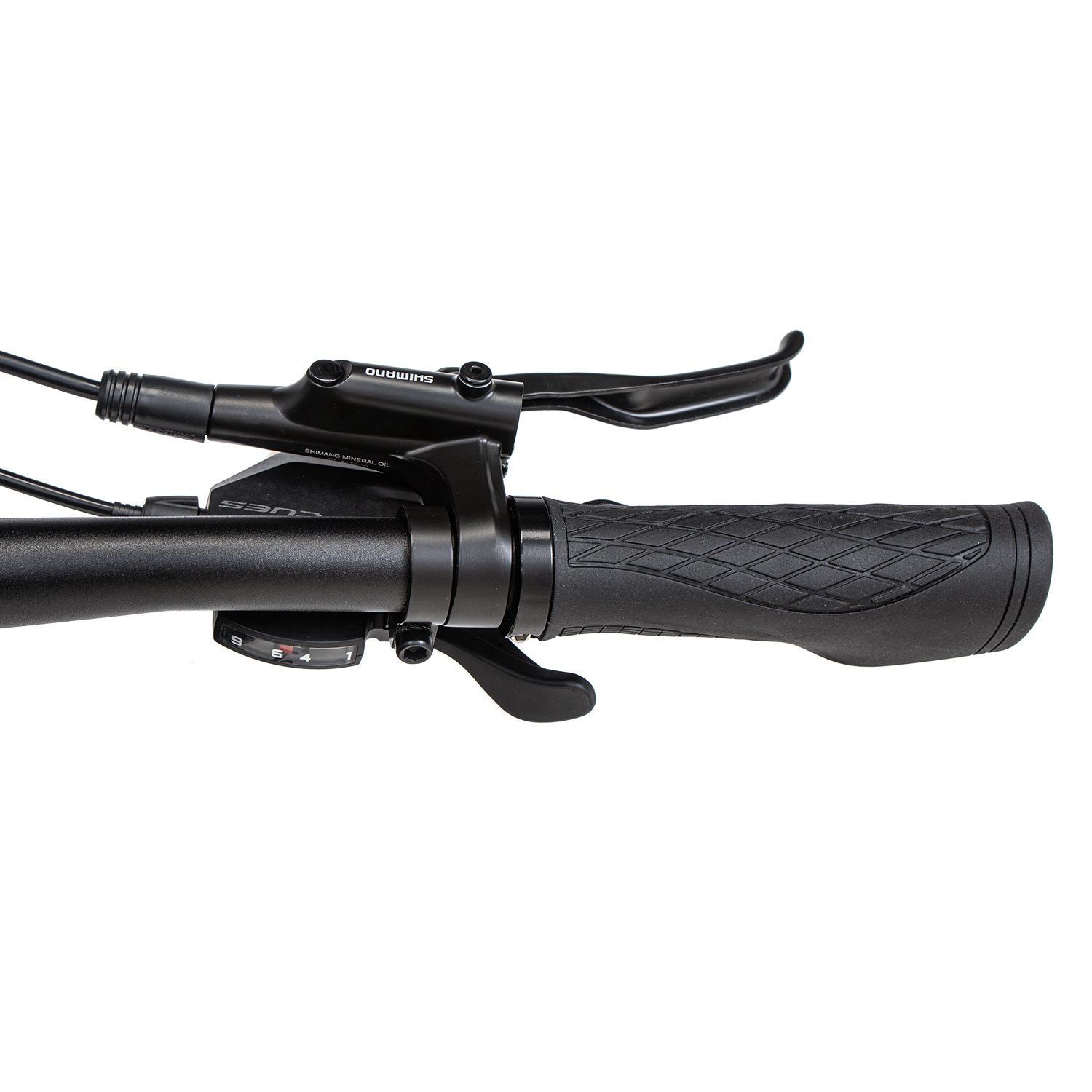 - Трансмиссия Shimano CUES с одной звездой 40T и кассетой 11–36T (9 скоростей) подходит для ровных улиц и лёгких подъёмов.